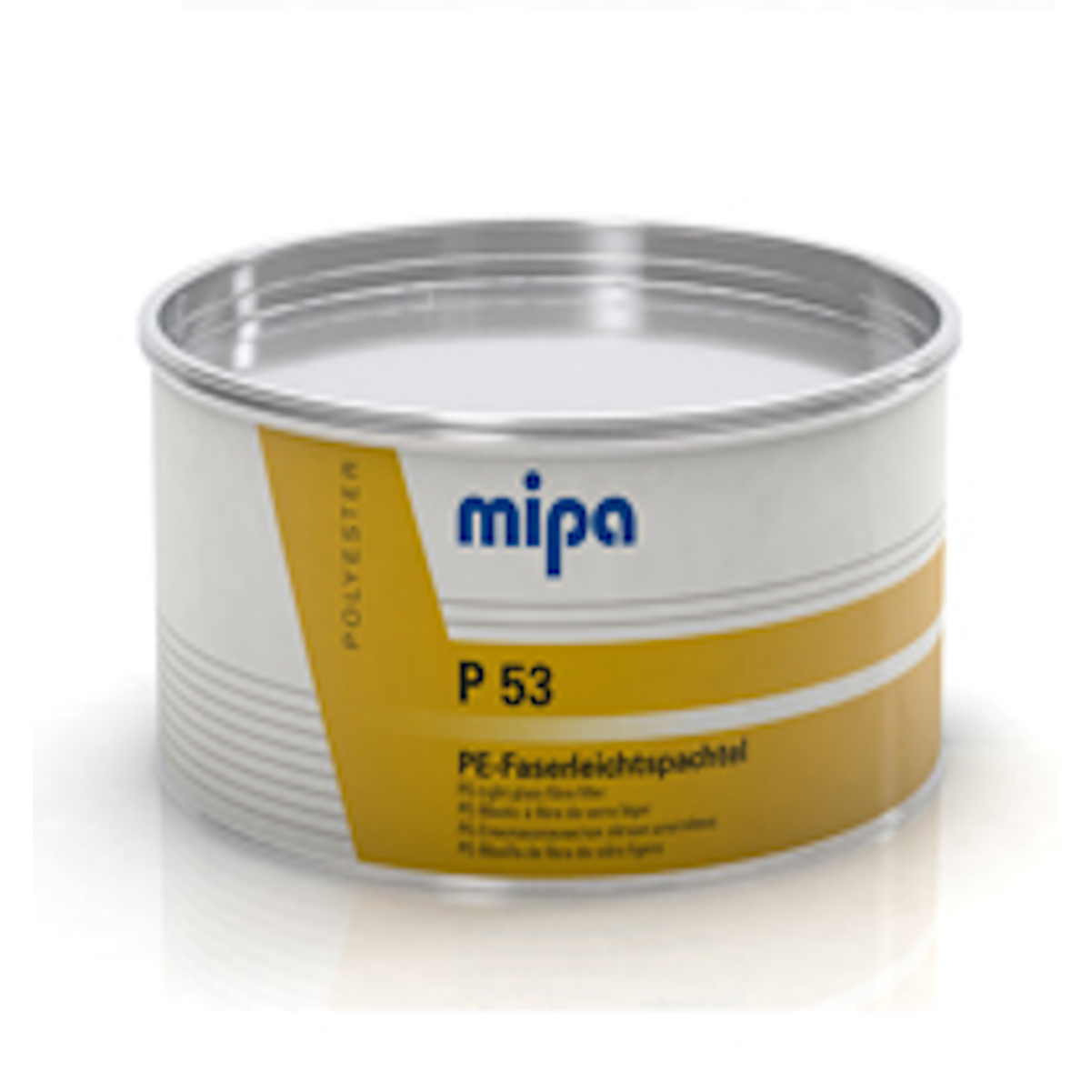 Mipa P 53 ist ein sehr leicht schleifbarer 2-Komponenten Glasfaser-Leichtspachtel auf Polyesterharz-Basis mit Haftung auf Eisen und Stahl, Zink, Aluminium, GfK und Holzuntergründen mit einem sehr niedrigen spezifischen Gewicht von ca. 1,05 - 1,1 g/ml. Aufgrund seines Anteils an Glasfasern ist das Produkt besonders gut zum Überbrücken von Rissen, kleineren Löchern und Durchrostungen in der PKW-Reparatur, im Fahrzeug- und Maschinenbau geeignet. Da Mipa P 53 eine sehr geringe Dichte aufweist, eignet sich das Material auch hervorragend für den Einsatz im Modellbau und Bereichen, in denen Gewichtsreduktion gefordert wird. Zudem wird durch die hohe Wasserbeständigkeit ein problemloser Einsatz im Bootsbereich gewährleistet.